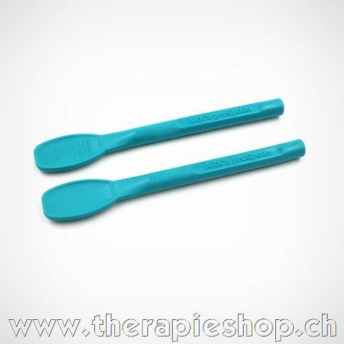 Der flache proSpoon ist in zwei verschiedenen Versionen erhältlich - glatt oder strukturiert. Die strukturierte Version hat gerippte Linien im Inneren der Löffelschale und sanfte Unebenheiten auf der Rückseite, wodurch Ober- und Unterlippe sowie die Zunge gleichzeitig taktil stimuliert werden. Verwenden Sie den Löffel, um pürierte Lebensmittel wie Joghurt, Apfelmus, Babynahrung der Stufe 1 usw. mit Textur zu versehen.
