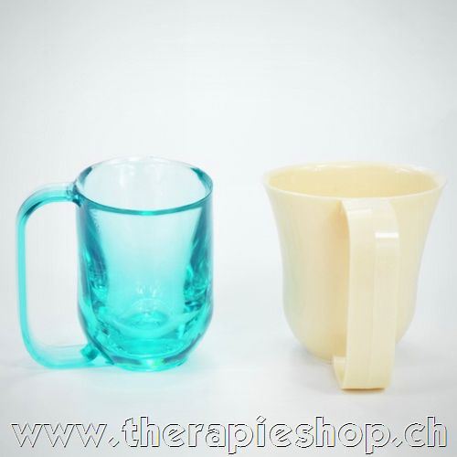 Grosser Griff und leichte oval Form für eine direkte Leitung der Flüssigkeit. Der Becher ist mit einem zusätzlichen Gewicht erschwert und vermindert somit eventuelles Zittern. Die spezielle Form der Öffnung bietet der Nase entsprechende Freiheit und ermöglicht ein Trinken ohne Kippen des Kopfes.