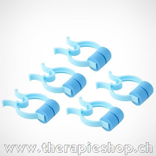Die Nasenklammern sind hervorragend bei Patienten geeignet, welche Schwierigkeiten beim differenzieren zwischen oraler und nasaler Atmung während Anwendungsübungen mit Tröten, Seifenblasen oder bei Pustübungen haben. Die beigelegten Gummibänder dienen können dazu eingesetzt werden um den Druck auf die Nasenflügel zu erhöhen.