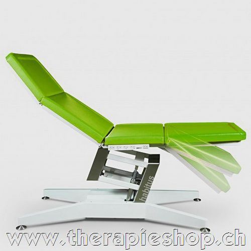 Modernes Design für das BehandlungszimmerLiegefläche ca. 195 x 65 cm, Ausführung 4-teilige Liegefläche: 4 getrennte Verstellmöglichkeiten mittels Gasdruckfeder Kopfteil positiv/negativ verstellbar Rückenteil fast senkrecht anstellbar Sitzteil neigbar Fussteil nach unten abklappbar Ausführung 2-teilige Liegefläche optional elektrische Höhenverstellung von 58 - 95 cm mittels Handschalter höhenjustierbare Standfüsse strapazierfähiger, pflegeleichter Polsterbezug Farbe nach Wahl