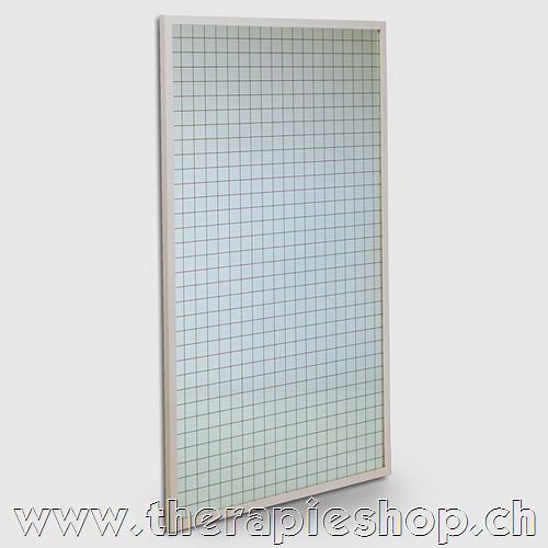 Mit dem Raster ermöglichen Sie eine genaue Kontrolle über Position, Haltung und Bewegung. Auch Fortschritte lassen sich genau dokumentieren, z.B. bei der Dehnung eines Therabandes. Die Neigung ist für jeden Patienten individuell stufenlos einstellbar. Kristallglas, eingefasst in pulverbeschichtetem Stahlrahmen mit fahrbarem Untergestell. 170x100cm.