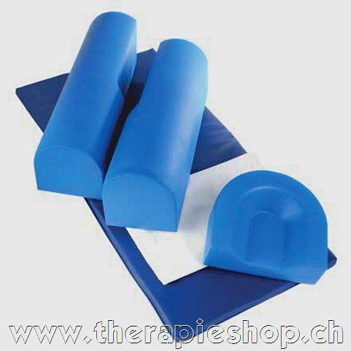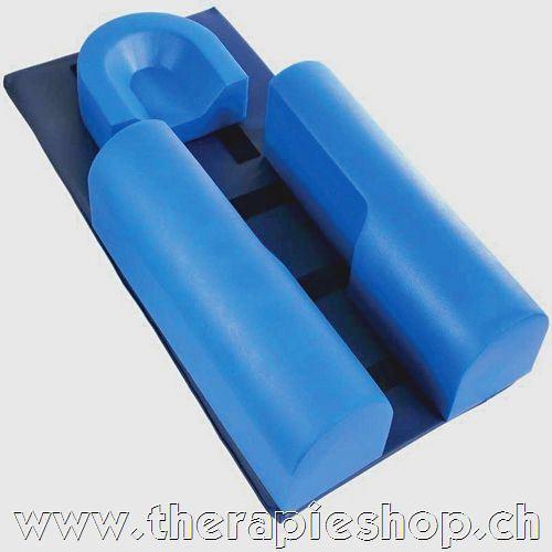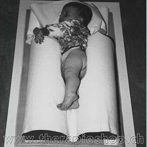 Mit diesem Seitenlagerungskissen können Babys und Kleinkinder einfach und problemlos sonographisch untersucht werden. Die Babys liegen entspannt und optimal gelagert zwischen zwei weichen aber formstabilen Schaumstoff-Dreiviertelrollen. Abgedeckt sind diese mit einem Frottee-Nässeschutz. Es entsteht eine Lagerung nach dem Hängemattenprinzip. Abstandverstellung durch Klettverschlüsse. Alle Schaumstoffteile sind mit PUR-Haut (wischdesinfizierbar) beschichtet.